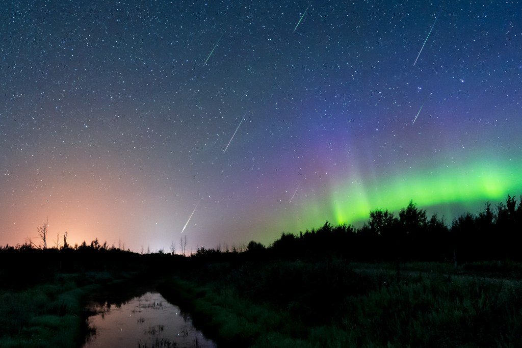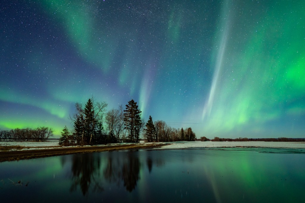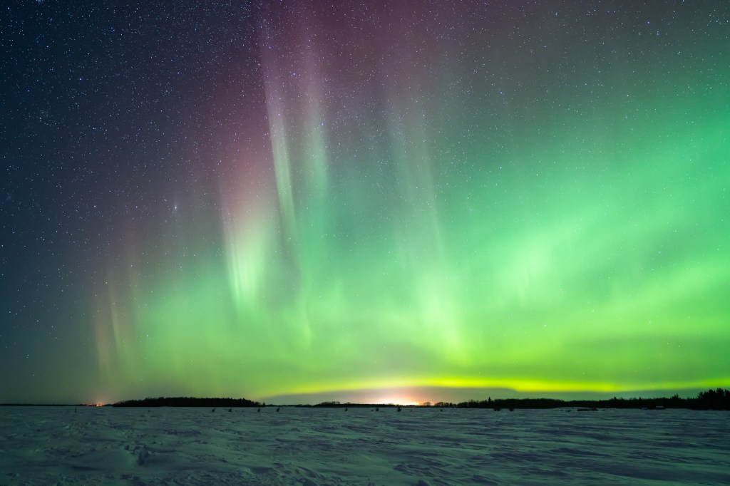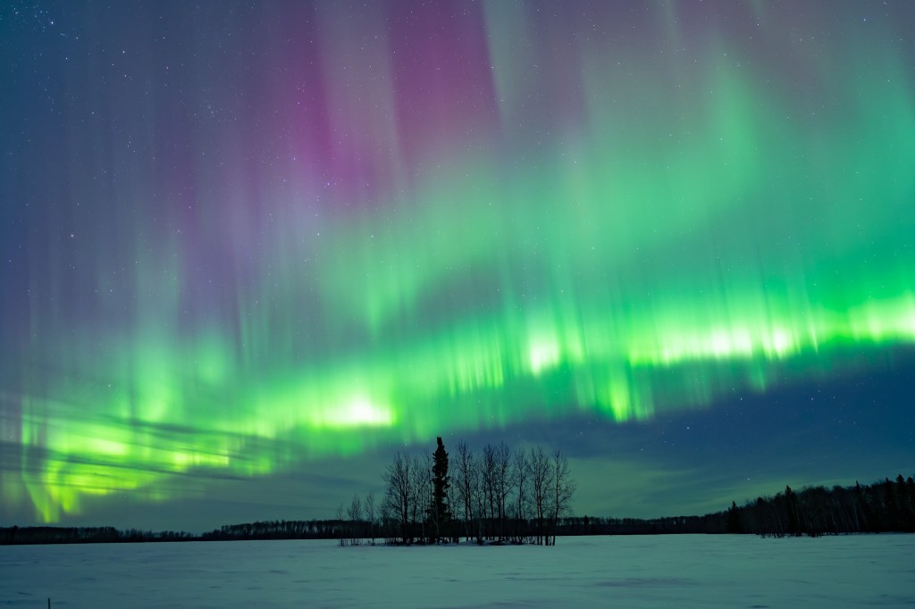 The Aurora Borealis (Northern Lights) in the North and the Aurora Australis (Southern Lights) in the south are created by the reaction between the sun’s energy being released and colliding with Earth’s magnetic field. The charged particles are pulled toward the north and south poles and emit light during their interactions. The colour of the display depends on the reaction between different elements, causing a highly unpredictable display of light in shades of green, purple, blue and red.