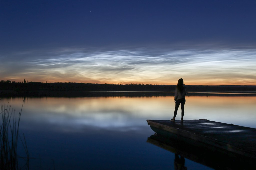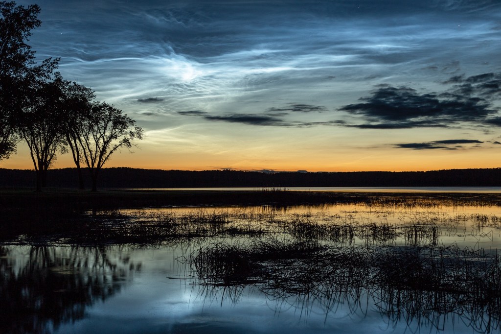 Seen during early summer, during astronomical twilight, these clouds are the highest in our atmosphere and are reflecting sunlight high into the night. I write more in detail about these fascinating clouds, here.
